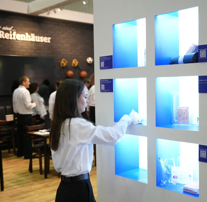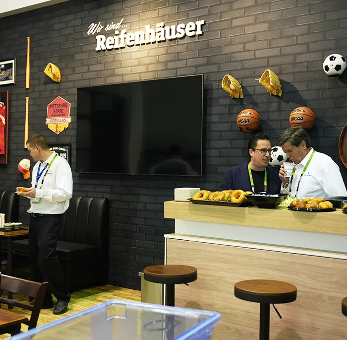 We built the booth around a clear strategy: attract visitors with the equipment, communicate value through digital, and create space for serious conversations. The layout gave the machinery strong visibility while keeping the booth open and easy to navigate. Visitors then flowed into a dedicated digital zone with a curved screen that connected the displays to Reifenhäuser’s broader message around sustainability, digitalization, and productivity. At the center, we placed a themed sports bar with dark brick finishes, sports decor, neon signage, working beer taps, and a functional counter. Paired with private meeting rooms, it gave the booth a distinct identity and helped turn short visits into longer discussions.