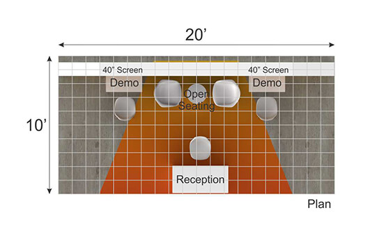 The classic look and feel with modern utility, this 10’X20’ island space makes way for effective communication; A customer lounge closed meeting rooms and open discussion areas.