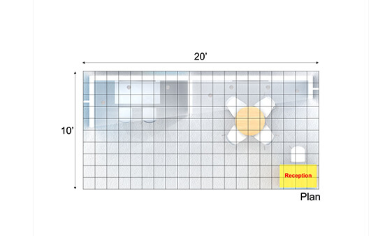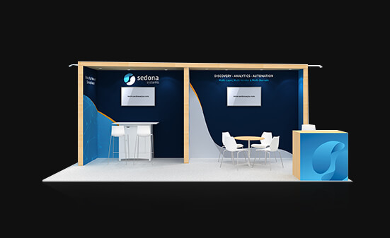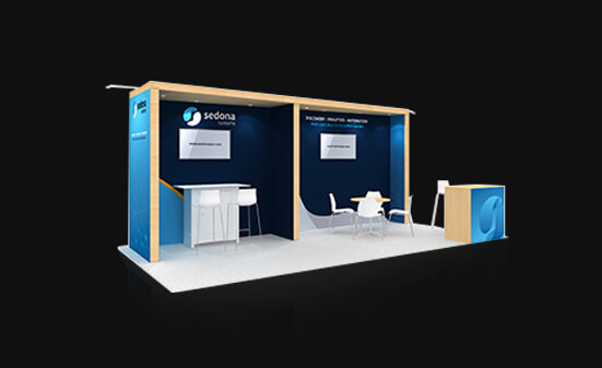 When you want to give your customers a premium experience to discuss business the UE1020 02 offers more. With a classy lounge, a closed meeting room, and an open workstation area you can engage your regular clients, prospects and walk-in visitors with ease. The reception counter has plenty of lockable storage and is placed with a back wall graphic in a way that the booth has good elbow room for easy movement.